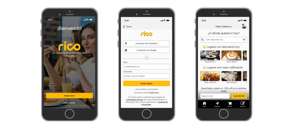 RICO es una App móvil que encontrar restaurantes, cafeterías y bares mediantes filtros de geolocalización y valoración. Permite reservar, ver ofertas y valor mínimo del plato, lo cual ayuda a los comensales a seleccionar de manera rápida el café, restaurante o bar ideal.